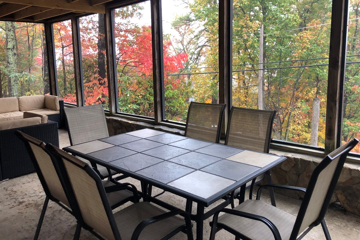 The screened porch is open to refreshing breezes while keeping out bugs. You can hang out here, kick back on the patio furniture and feel like you’re in the great outdoors as you take in the view. A large table and chairs make the porch a good spot for lunch or board games.